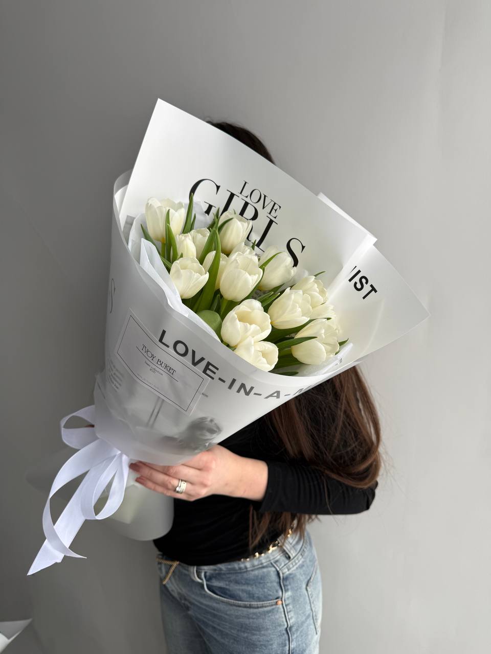 15 белых тюльпанов в оформлении